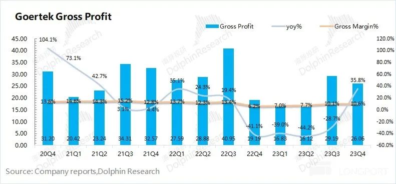 歌爾股份 2023 年第四季度實(shí)現(xiàn)毛利 26.06 億元,同比增長(zhǎng) 35.8%,毛利的下滑主要由毛利率大幅下滑所致。