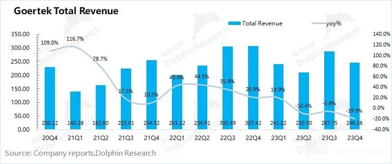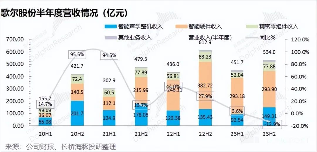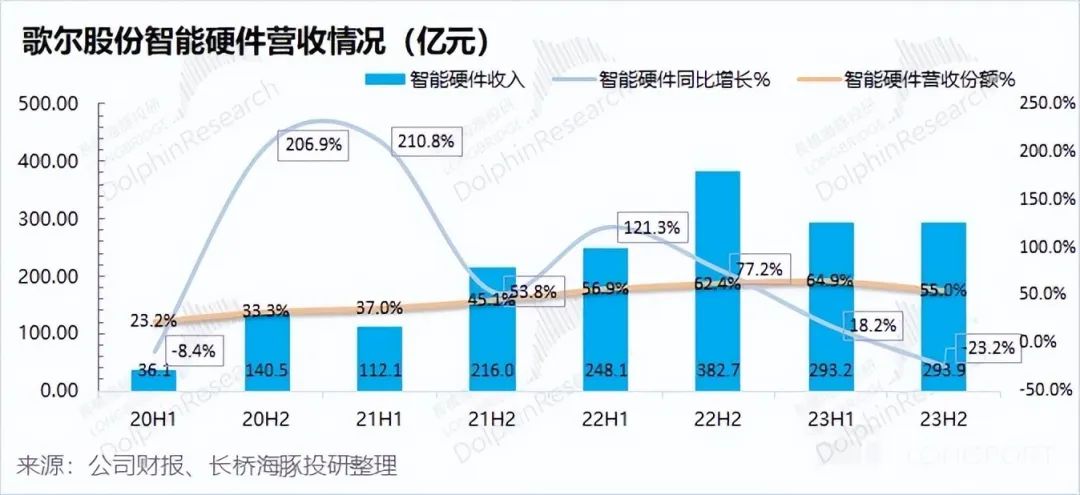 歌爾股份 2023 年第四季度總營(yíng)收 246 億元,同比下滑 19.9%,低于市場(chǎng)預(yù)期(312 億)。營(yíng)收下滑,主要受智能硬件和精密零組件業(yè)務(wù)下滑的拖累。