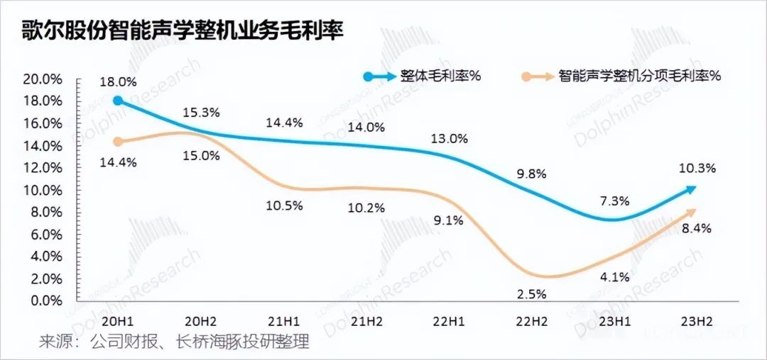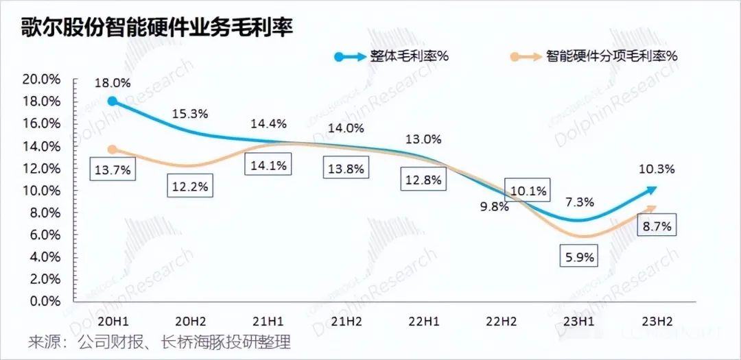 歌爾股份智能硬件業(yè)務(wù) 2023 年下半年毛利率實(shí)現(xiàn) 8.7%,同比下滑 1.1pct。下游需求不足,直接影響公司出貨情況和盈利能力,毛利率繼續(xù)維持在個(gè)位數(shù)。