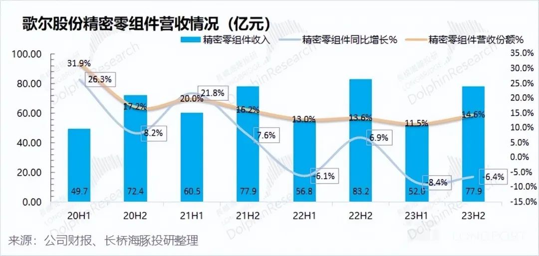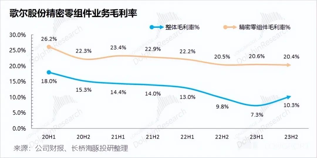 歌爾股份精密零組件業(yè)務(wù) 2023 年下半年毛利率為 20.4%,同比下滑 0.1pct。公司精密零組件毛利率整體穩(wěn)定在 20% 左右水平。