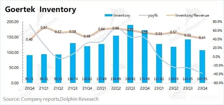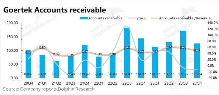 ①應(yīng)收帳款:歌爾股份 2023 年第四季度應(yīng)收帳款 125.64 億元,同比下滑 12.9%。從應(yīng)收帳款/營(yíng)業(yè)收入指標(biāo)看,歌爾股份本季度為 0.51,維持在相對(duì)合理水位。