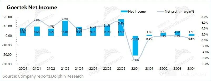 歌爾股份 2023 年第四季度歸母凈利潤(rùn) 1.96 億元,扭虧為盈,遠(yuǎn)低于市場(chǎng)預(yù)期 7.1 億元。歌爾股份本季利潤(rùn)不及預(yù)期的主要原因,是收入端表現(xiàn)不佳,主要是智能硬件業(yè)務(wù)受市場(chǎng)需求減少的拖累。