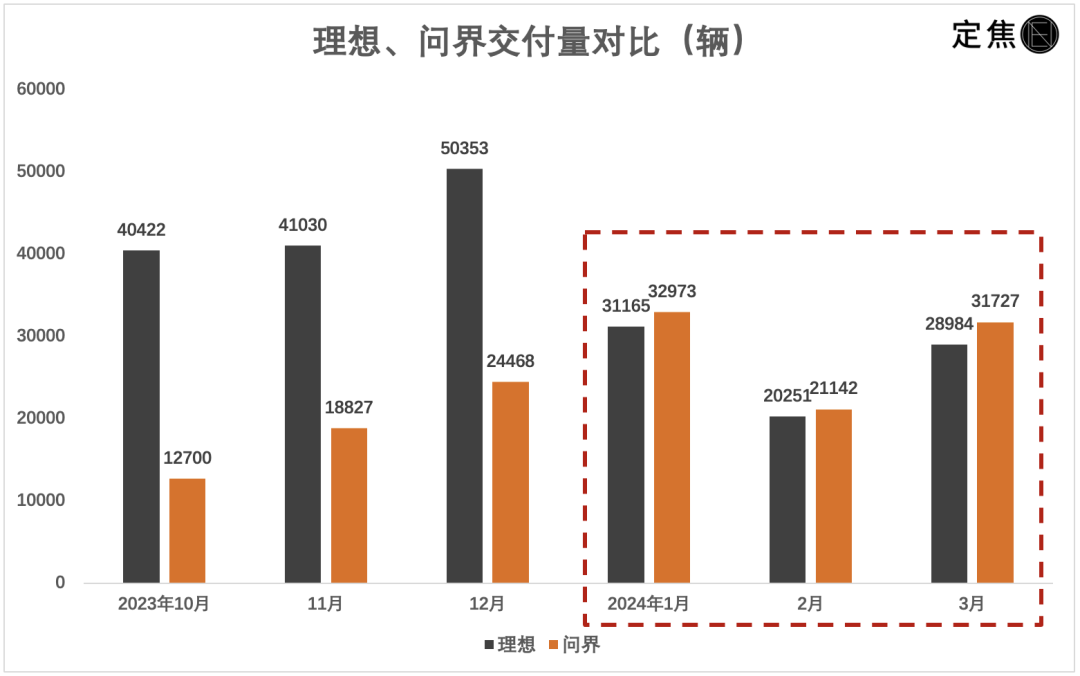 理想“摔跤”后,問界在3月繼續(xù)領(lǐng)先理想,交付31727輛。這是問界第三次超過理想。