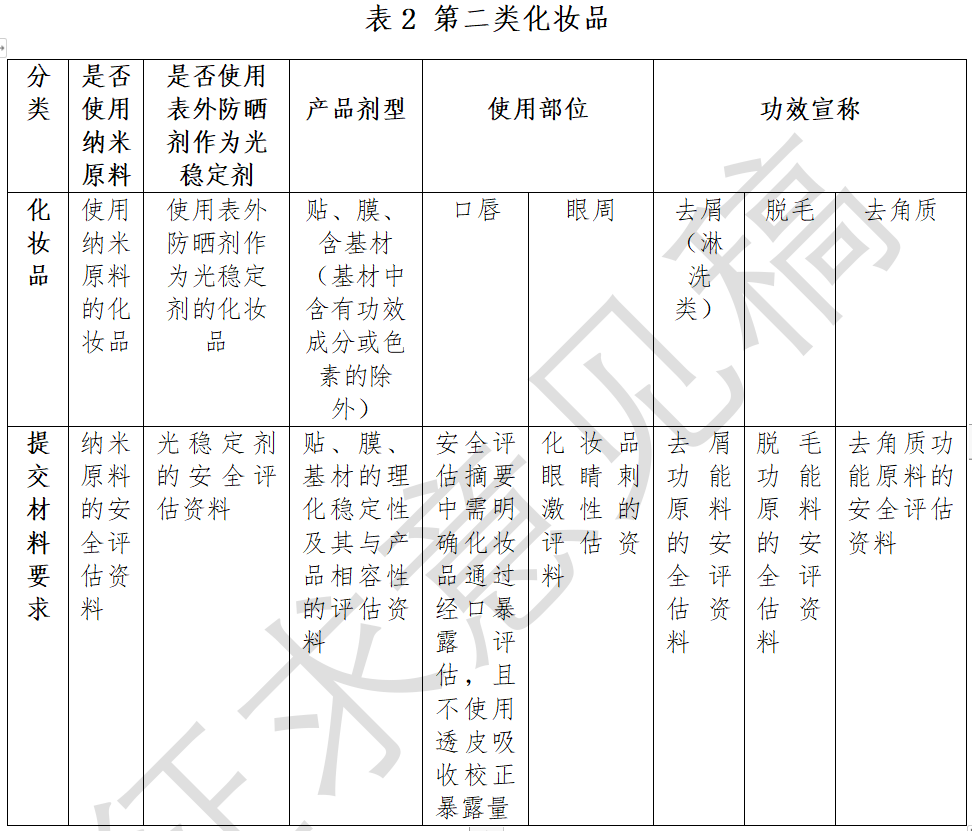 第二類化妝品是指:使用納米原料的化妝品,非防曬類化妝品中使用表外防曬劑作為光穩(wěn)定劑的化妝品,使用部位為口唇或眼周的化妝品,功效宣稱為去屑(淋洗類)、脫毛、去角質(zhì)的化妝品等。