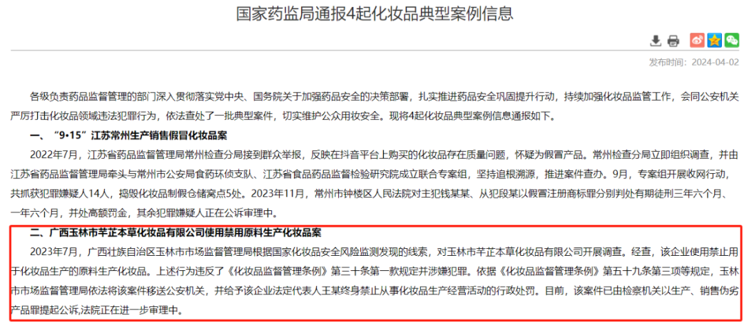 近日,國(guó)家藥監(jiān)局通報(bào)了4起化妝品典型案例,其中一起便與化妝品違規(guī)使用禁用物質(zhì)相關(guān)。