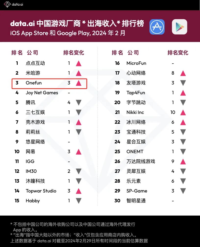 該游戲背后的廠商是北京元趣娛樂(OneFun)。得益于《Last War:Survival》的成功,元趣娛樂在今年2月份一舉超過騰訊、三七互娛等頭部大廠,沖上了國內(nèi)廠商出海收入榜單的TOP3(榜單來源:data.ai)。