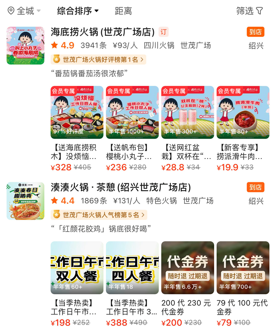 地點定位為“浙江省紹興市”,在美團(tuán)上搜索關(guān)鍵詞“火鍋”,新零售商業(yè)評論發(fā)現(xiàn),不少海鮮火鍋、牛肉火鍋、重慶火鍋、特色火鍋門店的人均消費逼近200元,其中3家海底撈分別以90元、93元、95元的人均消費排在靠后位置。