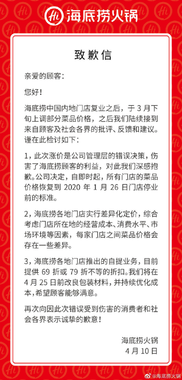 結(jié)果大家都知道了,事件逐漸發(fā)酵后,海底撈官方發(fā)布“致歉信”,決定“自即時起,所有門店的菜品價格恢復(fù)到2020年1月26日門店停業(yè)前的標(biāo)準(zhǔn)”。