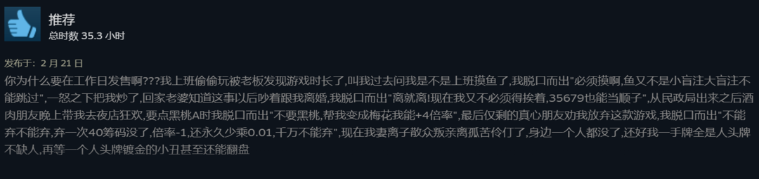 不過,作者本人可不是什么牌佬,更不是什么賭狗,在游戲被下架后他還表示,如果在游戲中主動加入賭博元素的話,自己的良心會遭到譴責(zé)的。