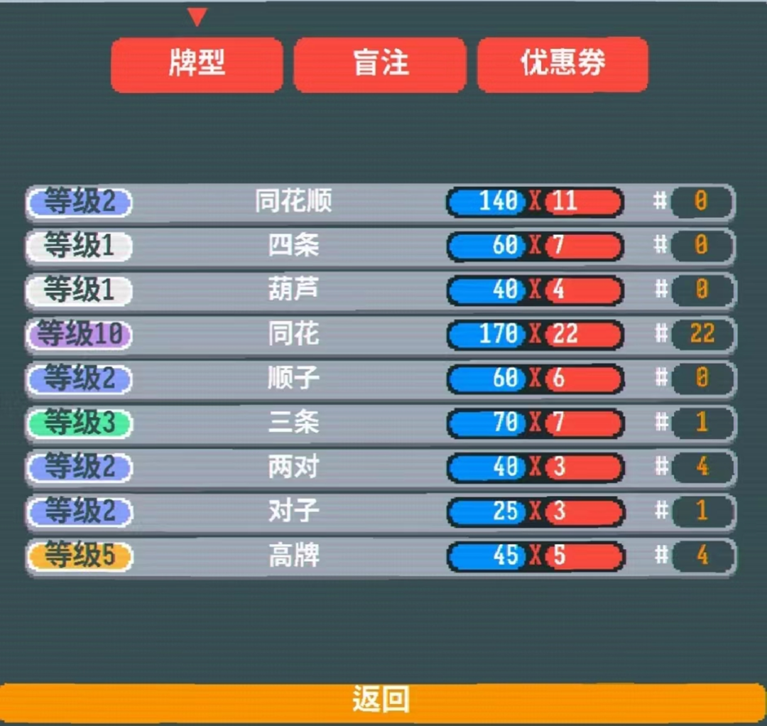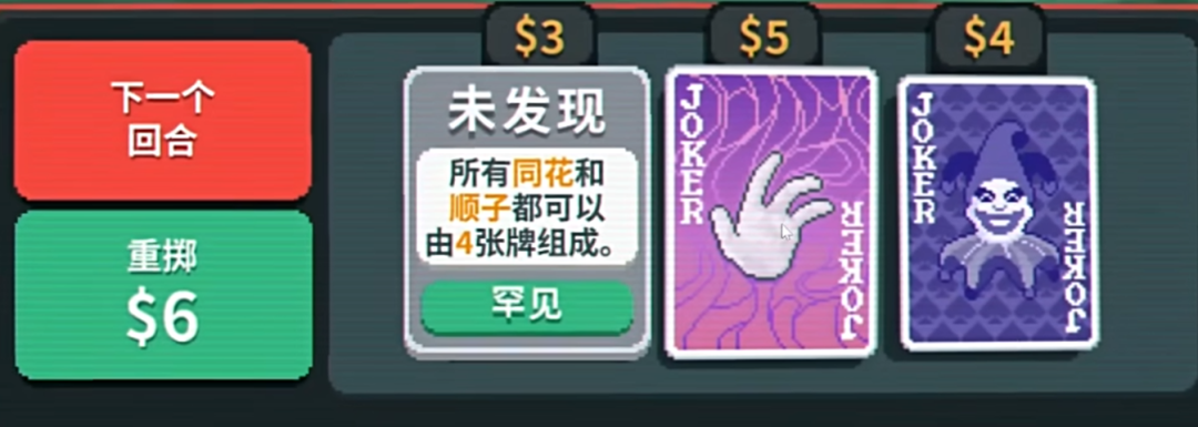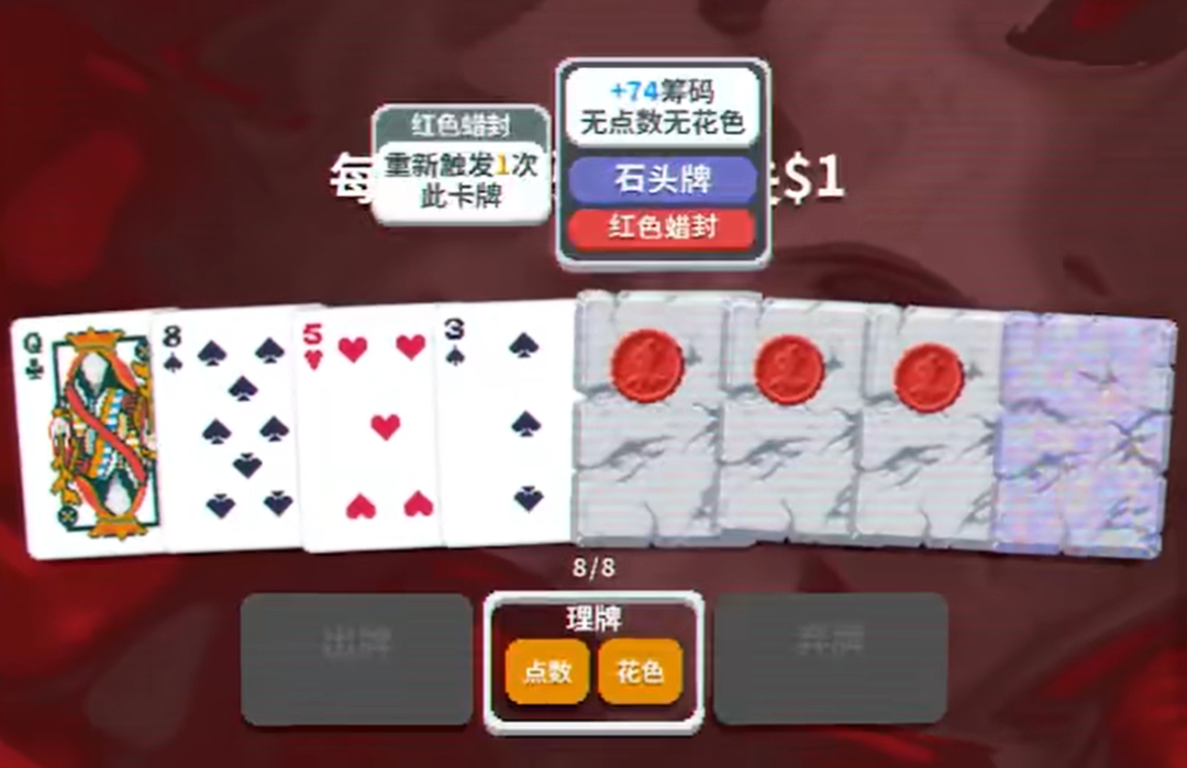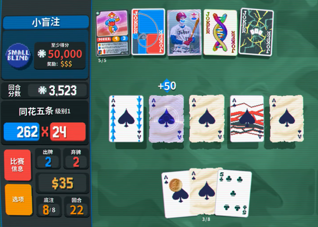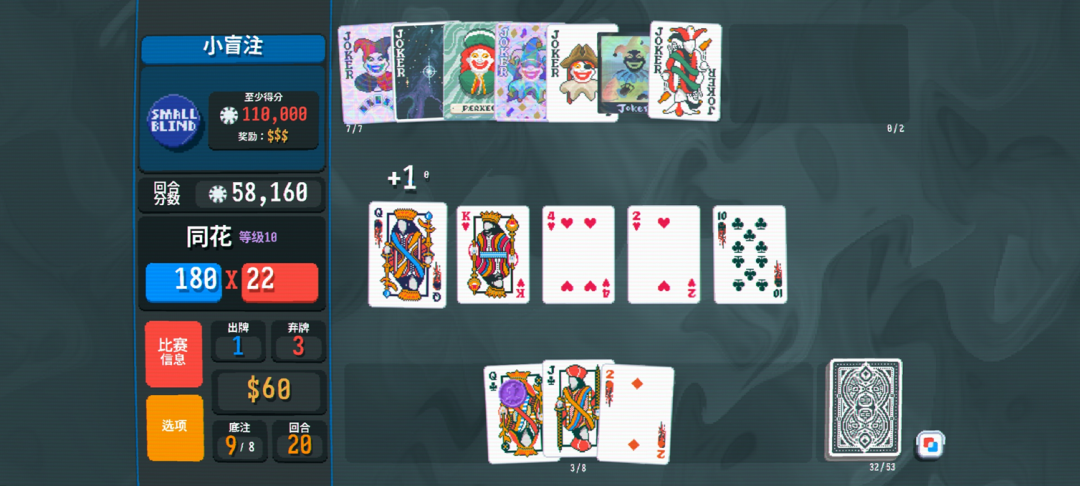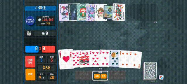 《小丑牌》其實也差不多的,通過湊牌型來獲得更高的分數(shù),然后達到關(guān)卡需要的分數(shù)就可以了。