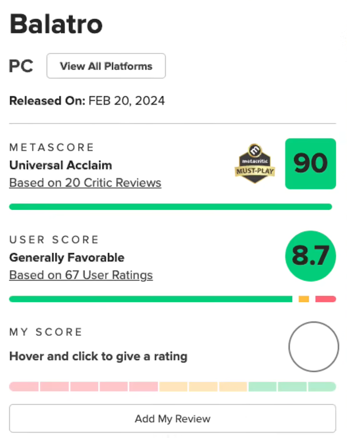 在Steam上,《小丑牌》的在線峰值已經(jīng)超越了肉鴿卡牌的概念神《殺戮尖塔》,M站的媒體均分也超過了90分,幾乎可以說是“貸款”年度最佳游戲設(shè)計獎了。