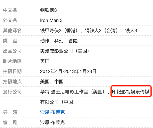 輝煌時期,印紀(jì)傳媒與好萊塢片方合作,出品了《環(huán)形使者》和《鋼鐵俠3》兩部中美合拍片,都取得了巨大的成功,尤其是《鋼鐵俠3》,在國內(nèi)收獲了7.54億元的票房,位列當(dāng)年國內(nèi)票房榜亞軍。