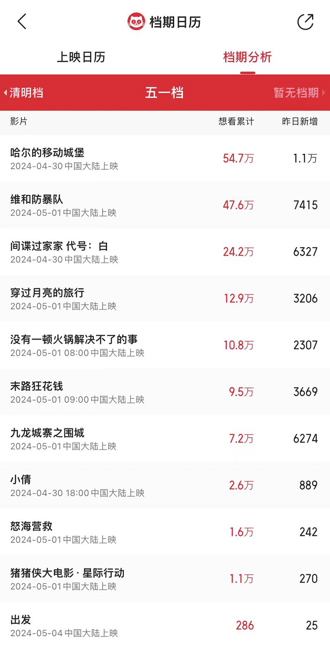 此外,根據(jù)貓眼專業(yè)版數(shù)據(jù),在接下來的五一檔,宮崎駿的《哈爾的移動(dòng)城堡》是目前想看人數(shù)最多的影片,同為引進(jìn)片的《間諜過家家代號:白》想看人數(shù)也達(dá)到24.2萬。由此可以推測,在即將到來的五一檔,引進(jìn)片還將持續(xù)發(fā)力,而在之后,儲備中的安妮海瑟薇新片《母親的直覺》,以及去年戛納電影節(jié)上的口碑之作《枯葉》等,也有望拿到不俗的表現(xiàn)。