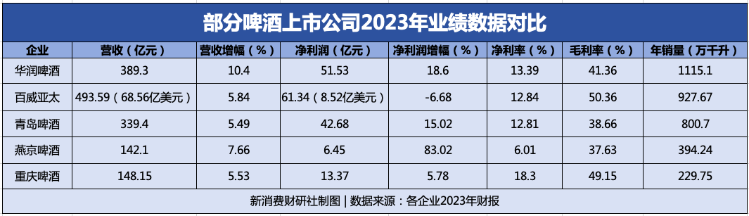 從2023年業(yè)績來看,行業(yè)TOP5華潤啤酒、百威亞太、青島啤酒、燕京啤酒以及重慶啤酒均實現營收增長。除了百威亞太之外,另外四家中國啤酒巨頭也實現了凈利潤增長。