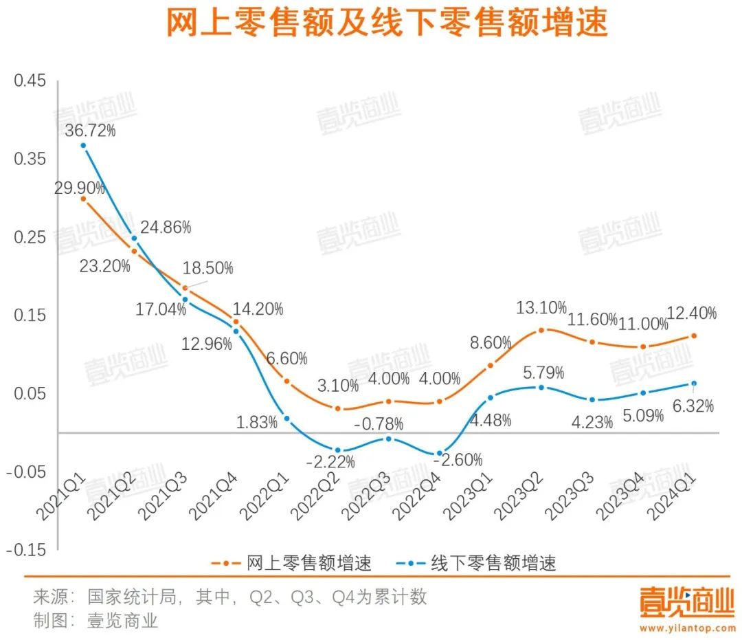 壹覽商業(yè)計算了線下零售額及其同比增速,并與網(wǎng)上零售額進行對比。很顯然,自2021年第三季度起,線下零售額的增速低于網(wǎng)上零售額,且有一段時間呈現(xiàn)負增長態(tài)勢。