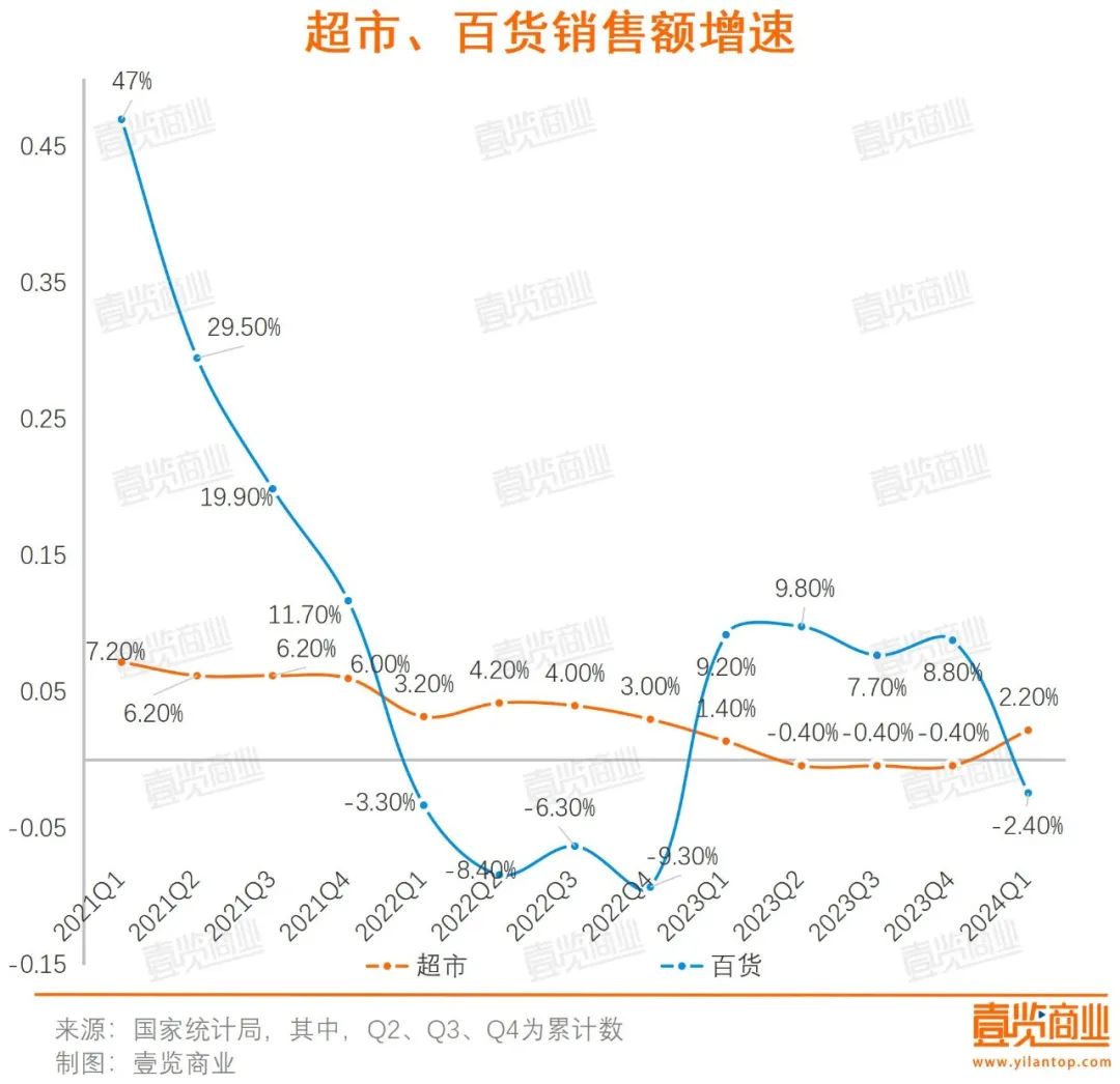 值得一提的是,超市業(yè)態(tài)與百貨業(yè)態(tài)的增長情況似乎呈現(xiàn)此消彼長的趨勢。2022年及2023年更為明顯:2022年超市業(yè)態(tài)增長速度穩(wěn)定在6%左右,百貨則全年負增長;2023年百貨業(yè)態(tài)增長率開始回升,而超市業(yè)態(tài)開始下降,且大半年時間呈現(xiàn)負增長狀態(tài)。
