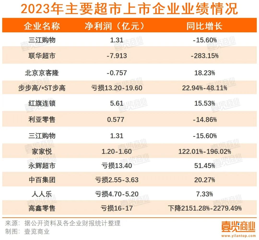從業(yè)績來看,12家已公布業(yè)績報告或業(yè)績預(yù)告的超市企業(yè)中,有7家處于虧損狀態(tài),4家處于微盈利狀態(tài),而成績最為矚目的紅旗連鎖,僅取得凈利潤5.61億的成績。