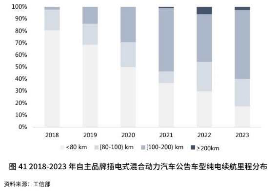 混合動(dòng)力中電驅(qū)動(dòng)的比例逐步提升?;靹?dòng)架構(gòu)由以內(nèi)燃機(jī)為主的并聯(lián)式向以電驅(qū)動(dòng)為主的雙電機(jī)串并聯(lián)式結(jié)構(gòu)和串聯(lián)增程式方向演進(jìn)。純電續(xù)航方面,如今 PHEV 純電續(xù)航不再緊貼補(bǔ)貼標(biāo)準(zhǔn)下限,轉(zhuǎn)而以用戶實(shí)際需求為依據(jù)搭載較大容量電池。工信部新車公告數(shù)據(jù)顯示,近年P(guān)HEV純電續(xù)航里程不斷提高,向100-200 公里區(qū)間聚集。