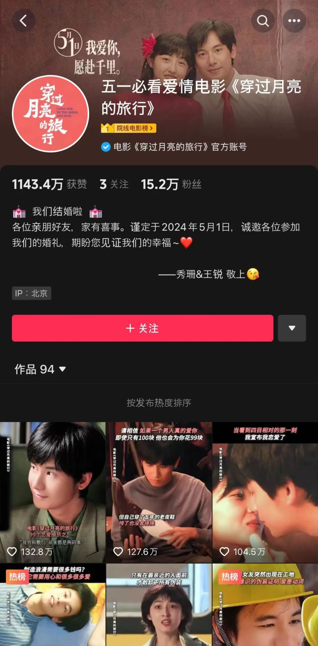 別的不看,光是“五一必看愛情電影《穿過月亮的旅行》”這個自帶廣告效果的官抖名,就絕對足夠為觀眾留下深刻印象。還有有趣的婚禮請柬文風(fēng)簡介,配上效果甚佳的短視頻物料。不出意外的話,《穿過月亮的旅行》或許將成為同檔期短視頻傳播效果最好的影片之一。