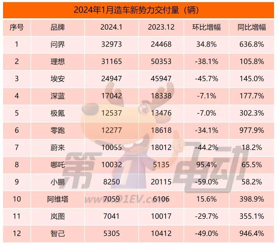 從2024年1月開始,賽力斯和華為合作的問界系列,首次登上新勢力月度銷量第一的寶座。