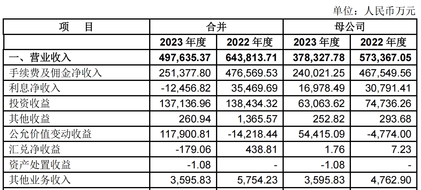 與之對比,固有業(yè)務(wù)三項收入明細則相對占優(yōu)。其中,投資收益實現(xiàn)13.71億元,與2022年相對持平;公允價值變動也實現(xiàn)扭虧,全年實現(xiàn)收益11.79億元。