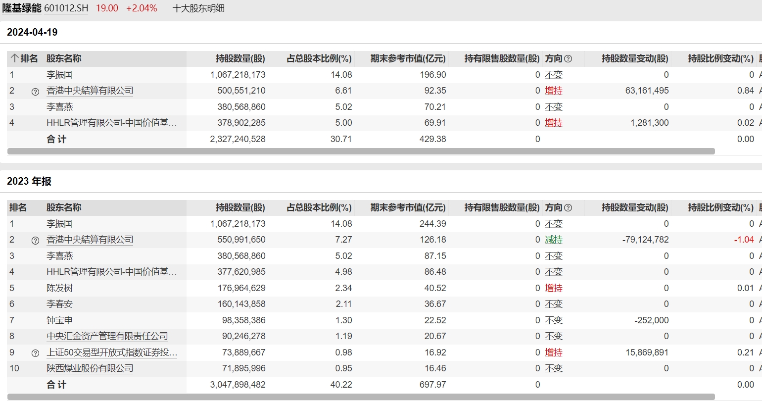 持股減少的不僅一位大股東。2023年年報(bào)數(shù)據(jù)顯示,第二大股東香港中央結(jié)算有限公司持股減少52.82萬股,第七大股東鐘寶申持股減少25.2萬股,第十大股東陜西煤業(yè)股份有限公司(證券簡稱:陜西煤業(yè),601225.SH)持股減少6555.96萬股。