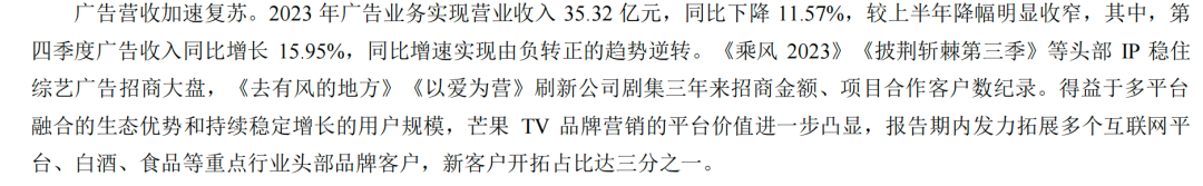 不過(guò),多點(diǎn)開(kāi)花的綜藝,掩蓋不了廣告收入下滑的事實(shí)。2023年財(cái)報(bào)顯示,芒果超媒2023年廣告業(yè)務(wù)實(shí)現(xiàn)營(yíng)收35.32億元,同比下降11.57%,不知今年能否挽回頹勢(shì)。