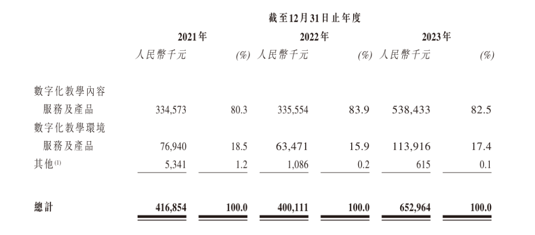 在商業(yè)化成果上,招股書顯示,2021年、2022年及2023年,智慧樹的營(yíng)收分別為4.17億元、4.00億元及6.53億元,復(fù)合年增長(zhǎng)率為25.2%。其中,數(shù)字化教學(xué)內(nèi)容服務(wù)及產(chǎn)品業(yè)務(wù)營(yíng)收分別為3.35億元、3.36億元及5.38億元,占總營(yíng)收的比例均在80%以上;數(shù)字化教學(xué)環(huán)境服務(wù)及產(chǎn)品業(yè)務(wù)收入分別為7694萬元、6347.1萬元及1.14億元。