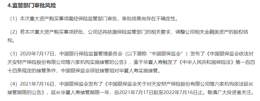 但該起收購經(jīng)歷多番波折后,到了2020年7月,華夏人壽被中國銀保監(jiān)會派出的接管組接管。一年后,該接管期限被延長至2022年7月16日。