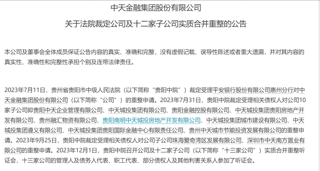 因不能清償?shù)狡趥鶆?wù),2023年7月,平安銀行貴州分行向貴陽中院對中天金融提起了重整申請。12月,貴陽中院召開中天金融及十二家子公司(簡稱“十三家公司”)實(shí)質(zhì)合并重整聽證會,并在12月28日發(fā)布《民事裁定書》,因中天金融系十三家公司中的核心控制企業(yè),,故貴陽中院確定以中天金融為重整主體,對十三家公司進(jìn)行實(shí)質(zhì)合并審理。