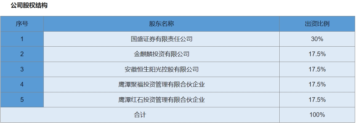 公開資料顯示,江信基金于2013年1月28日注冊成立,注冊地在北京市,注冊資本1.8億元人民幣。從股權(quán)結(jié)構(gòu)來看,國盛證券為第一大股東,持股占比為30%,金麒麟投資有限公司、安徽恒生陽光控股有限公司、鷹潭聚福投資管理有限合伙企業(yè)、鷹潭紅石投資管理有限公司合伙企業(yè)分別占比為17.5%。該公司沒有實際控制人。