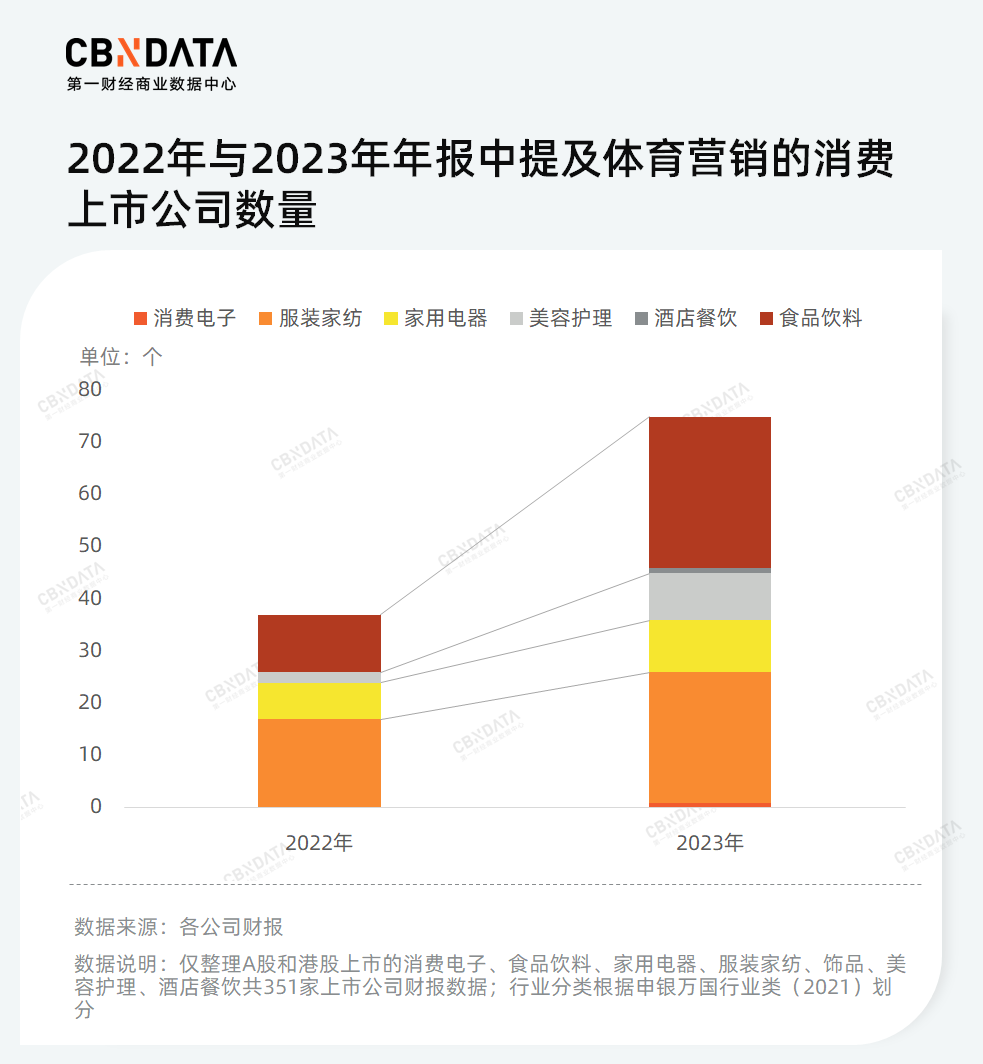 因此,2023年賽事復(fù)蘇使得品牌重新聚焦體育營(yíng)銷,并且表現(xiàn)出支持熱情不減。這點(diǎn)在許多品牌的去年年報(bào)得到明顯體現(xiàn)。CBNData不完全統(tǒng)計(jì),2023年超2成企業(yè)在其年報(bào)中提及體育營(yíng)銷。與2022年相比,提及體育營(yíng)銷的消費(fèi)企業(yè)數(shù)量實(shí)現(xiàn)了翻倍增長(zhǎng)。特別是在食品飲料和美容護(hù)理行業(yè),提及企業(yè)的數(shù)量有了顯著增加。