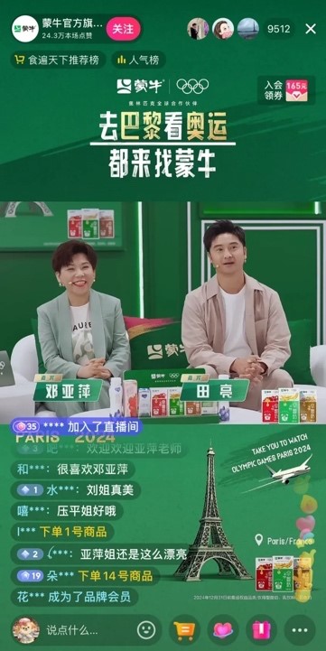 這種體育版權(quán)和社交平臺(tái)的融合,不僅拓闊了賽場(chǎng)的邊界,也徹底改變了體育IP和贊助商與受眾的建聯(lián)方式,尤其是直播這種即時(shí)且深度互動(dòng)的手段。因此,越來(lái)越多運(yùn)動(dòng)員做客直播間,以“品牌/頭部主播+體育明星”的方式破圈拓流,吸引更多體育消費(fèi)人群。2023年哈登、奧尼爾、菲戈、卡卡等NBA球星與足球明星就頻頻出現(xiàn)在各個(gè)直播間并為之火速積聚人氣。例如亞運(yùn)會(huì)期間,“大鯊魚(yú)”來(lái)到小楊哥直播間與人扳手腕,直播間的人氣迅速達(dá)到100萬(wàn),小楊哥自家產(chǎn)品在十秒內(nèi)售罄。而奧運(yùn)會(huì)開(kāi)幕在即,蒙牛直播間邀請(qǐng)了鄧亞萍和田亮等知名運(yùn)動(dòng)員,使得品牌活動(dòng)迅速傳播,“去巴黎看奧運(yùn)都來(lái)找蒙?!钡乃烷T票營(yíng)銷活動(dòng)在抖音閱讀量過(guò)億,討論人數(shù)破萬(wàn)。