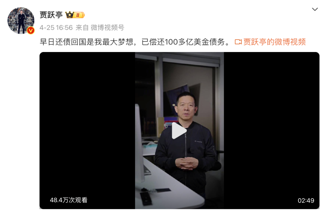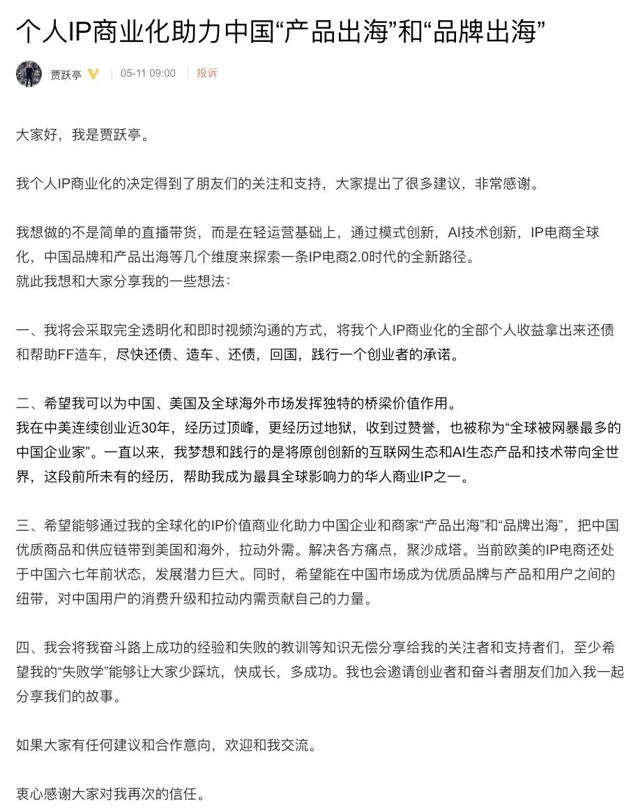 5月11日,賈躍亭再度發(fā)文回應(yīng)“個(gè)人IP商業(yè)化”相關(guān)話題,他表示個(gè)人IP商業(yè)化的全部個(gè)人收益都會(huì)拿來還債、造車。