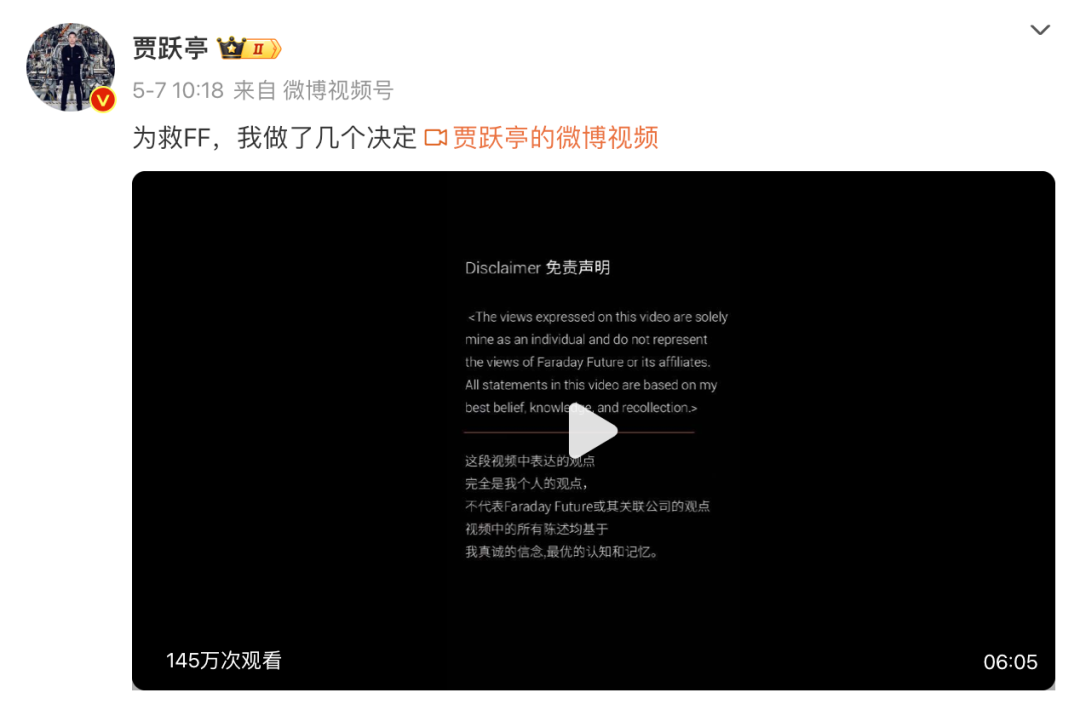 “我做出了一個(gè)和我個(gè)人追求不太一致的糾結(jié)決定,我將會(huì)開始通過我個(gè)人的IP商業(yè)化,盡快賺些錢,一部分還債,一部分救公司,用來貼補(bǔ)造車,力爭(zhēng)可以支持FF基本運(yùn)營(yíng),給投資人和股東信心,并會(huì)經(jīng)常和大家用視頻的方式同步‘FF夢(mèng)想保衛(wèi)戰(zhàn)’的進(jìn)展?!?/p>