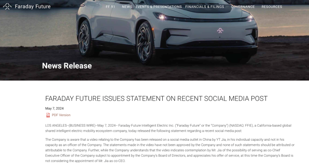 然而,F(xiàn)F火速發(fā)表聲明稱,賈躍亭以個(gè)人而非公司高管身份在社交媒體上發(fā)布了一段與公司有關(guān)的視頻,視頻中的聲明未經(jīng)公司批準(zhǔn),任何此類聲明都不應(yīng)認(rèn)為是公司所為。此外,雖然公司了解到該視頻表明賈躍亭考慮在公司董事會(huì)任命的情況下?lián)喂韭?lián)席CEO的可能性,并對(duì)其提供的服務(wù)表示贊賞,但目前公司董事會(huì)不考慮任命其為聯(lián)席CEO。