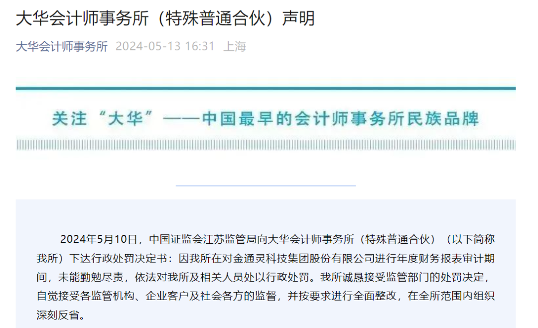 2023年底金通靈被曝出“上市13年,財務(wù)造假6年”而引發(fā)市場關(guān)注。2024年1月,因2017年至2022年年度報告存在虛增或虛減營業(yè)收入、利潤總額等虛假記載行為金通靈被江蘇證監(jiān)局處罰,而大華所是金通靈的審計單位。