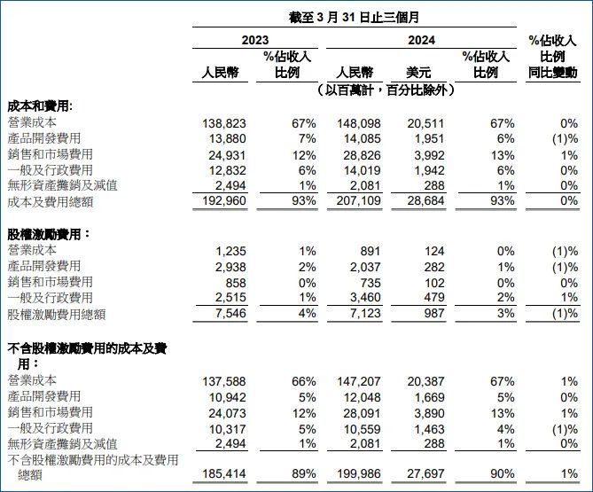 參考報告中的數(shù)據(jù),截至2024年3月31日止三個月,阿里營業(yè)成本為1480.98億元,占收入比例67%,與2023年同期相當。結(jié)合報告期內(nèi)營收同比增長7%的情況來看,凈利潤大幅下滑的原因的確如阿里解釋,主要是因為市值下跌帶來的損失。