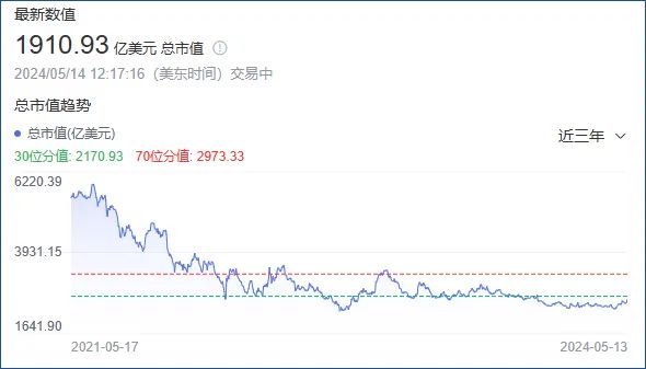 目前,阿里巴巴美股(紐交所代碼:BABA)總市值約1910.93億美元,同比2023年3月31日的2641.41億美元有近28%的下跌。近三年來,阿里巴巴市值最高位是2021年6月25日的6197.35億美元,如今下跌了近70%。