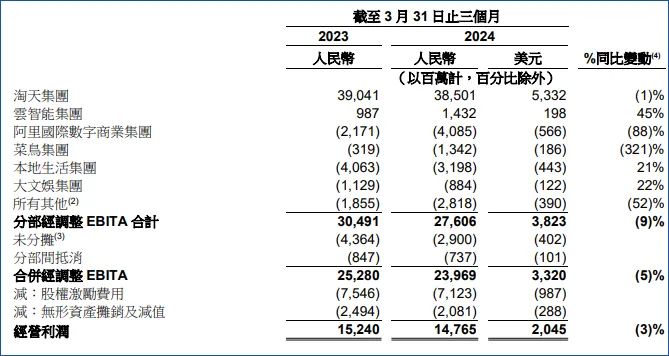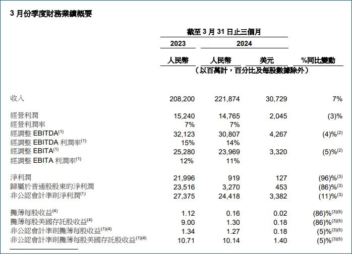 對此,阿里方面的解釋是:所持有的上市公司股權(quán)投資按市值計價變動而產(chǎn)生的凈虧損,而去年同期數(shù)據(jù)較高則為凈收益所致。若不考慮股權(quán)激勵費用、投資的收益(損失)、無形資產(chǎn)減值及其他若干項目,截至2024年3月31日止季度,非公認會計準則凈利潤為人民幣244.18億元,相比2023年同期的人民幣273.75億元減少了11%。
