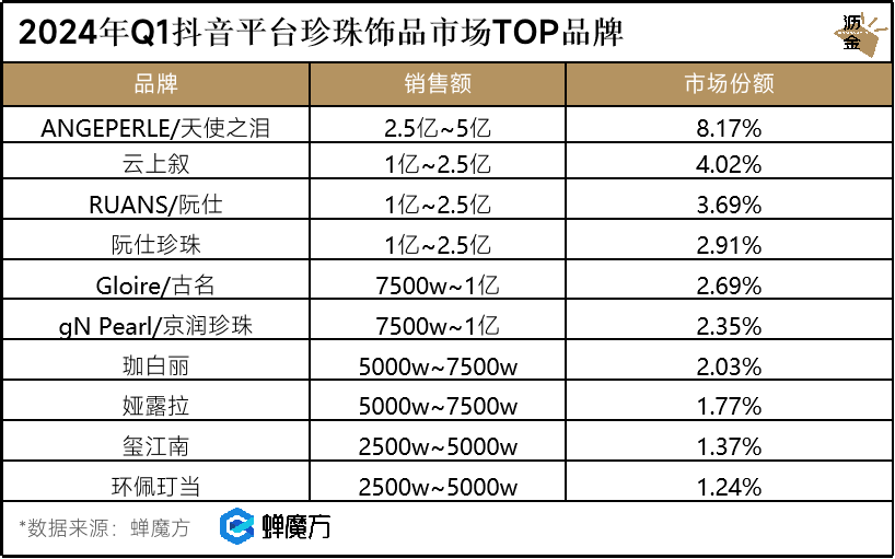 2024年Q1抖音平臺珍珠飾品市場TOP品牌