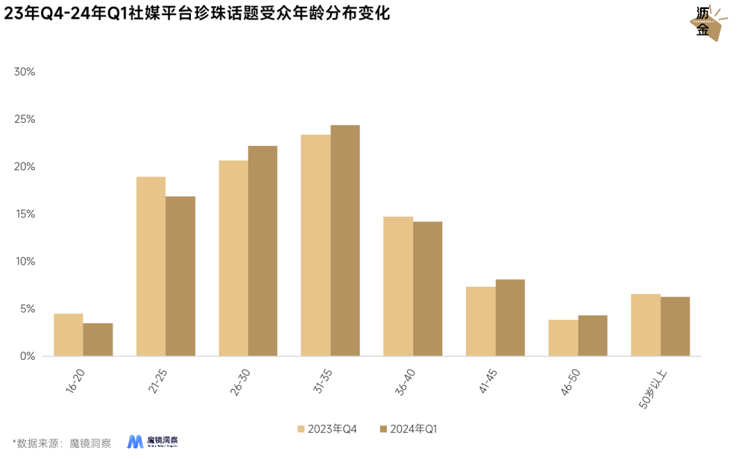 23年Q4-24年Q1社媒平臺珍珠話題受眾年齡分布變化