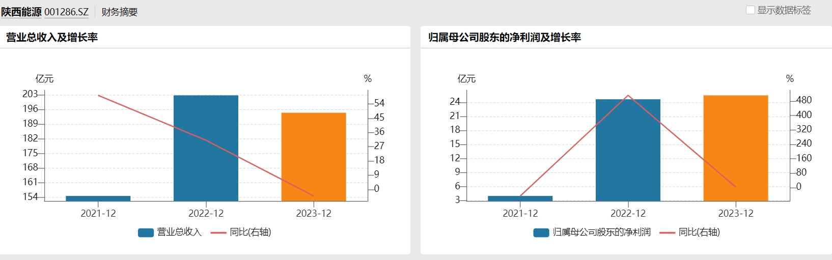 2023年,陜西能源實現(xiàn)營收194.53億元,同比減少4.1%;歸母凈利潤25.56億元,同比增長3.30%。