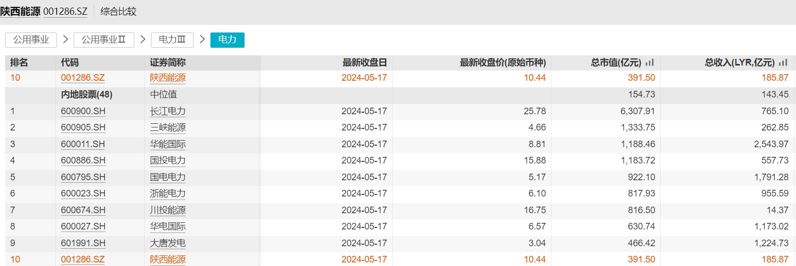 Wind數(shù)據(jù)顯示,根據(jù)最新收盤股價、總市值(億元)、總收入(億元)、凈利潤(億元)、ROE(%)、Beta(最近100周)多項指標(biāo)綜合比較,陜西能源在同業(yè)綜合比較中排名第10位.