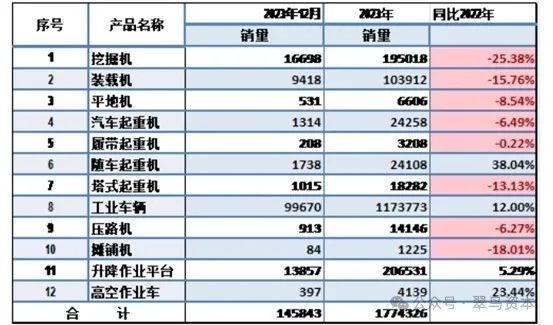 在中國(guó)工程機(jī)械工業(yè)協(xié)會(huì)公布的12個(gè)品類銷量中,2023年挖掘機(jī)、裝載機(jī)、平地機(jī)、汽車起重機(jī)、履帶起重機(jī)、塔式起重機(jī)、壓路機(jī)、攤鋪機(jī)等8類產(chǎn)品整體銷量下滑,而隨車起重機(jī)、叉車、升降工作平臺(tái)、高空作業(yè)車4類產(chǎn)品整體銷量呈現(xiàn)增長(zhǎng)。