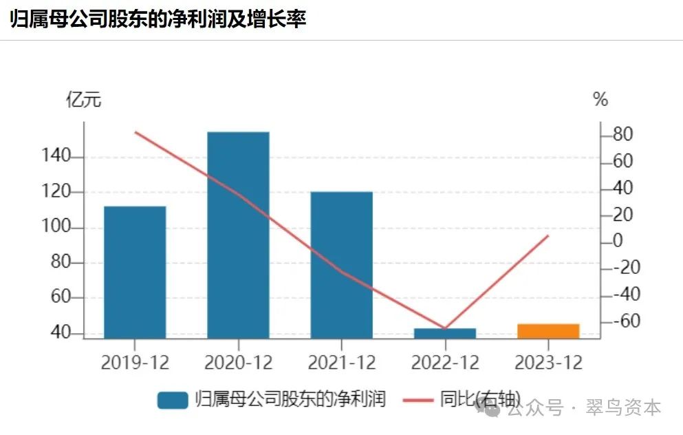 不過(guò),盡管公司總收入略有下降,但凈利潤(rùn)確實(shí)實(shí)現(xiàn)了增長(zhǎng),2023年凈利潤(rùn)45.27億元,同比增長(zhǎng)5.53%,其中,扣非凈利潤(rùn)43.88億,同比大增40.35%。
