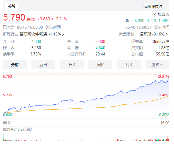 財報公布后,資本市場給出了正向反饋。愛奇藝股價較前一日大漲12.21%,報收于5.79美元/股,市值達55.56億美元。