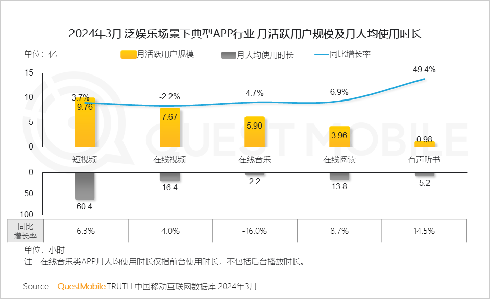 其二,長視頻的會員規(guī)模增長面臨著更嚴峻的挑戰(zhàn)。據(jù)QuestMobile數(shù)據(jù),在2024年3月泛娛樂場景下的典型APP行業(yè)中,有且僅有在線視頻的月活躍用戶規(guī)模出現(xiàn)同比下滑,其中愛騰優(yōu)芒均呈現(xiàn)出不同程度的下滑。但同一時間線上,抖音旗下的短劇APP——紅果免費短劇月活躍用戶規(guī)模同比大漲6951.8%。
