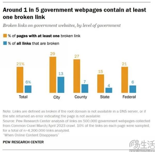 皮尤研究中心的研究人員還檢查了政府網(wǎng)站、新聞網(wǎng)站,以及維基百科頁面中“參考文獻(xiàn)”的部分鏈接,發(fā)現(xiàn)有23%的新聞網(wǎng)頁和21%的政府網(wǎng)站網(wǎng)頁中至少包含一個(gè)已失效的鏈接。即使是擁有來自全球大量志愿者維護(hù)的維基百科,這一網(wǎng)絡(luò)百科全書中也有11%的參考資料不能訪問,54%的頁面在其“參考文獻(xiàn)”部分中至少包含一個(gè)指向已不存在的頁面鏈接。