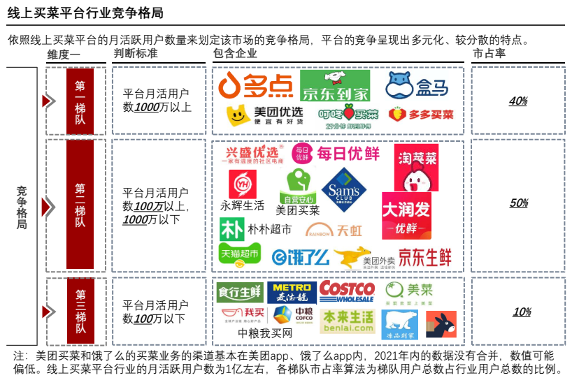 頭豹數(shù)據(jù)顯示,2022年,即時(shí)零售消費(fèi)市場呈現(xiàn)多元化、較分散的特點(diǎn)。其中多點(diǎn)、京東到家、美團(tuán)優(yōu)選等六家平臺位列第一梯隊(duì),占據(jù)40%左右的份額;興盛優(yōu)選、每日優(yōu)鮮、永輝超市等13家平臺占據(jù)位列第二梯隊(duì),占據(jù)50%的左右的份額;食行生鮮、中糧、我買等平臺位列第三梯隊(duì),占據(jù)10%的左右的份額。